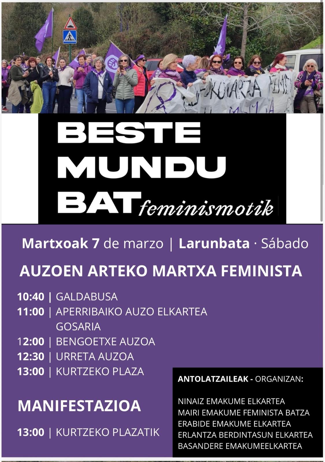 La marcha feminista entre barrios ha sido impulsada por las asociaciones Ninaiz Emakume Elkartea, Basandere Emakume Elkartea, Mairi Emakume Feminista Batza, Erlantza Berdintasuna Elkartea y Erabide Emakume Elkartea, en coordinación con el área municipal de Igualdad.