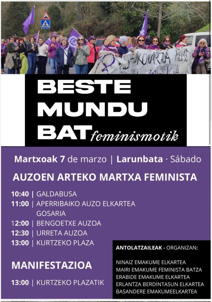 Auzoen arteko martxa feminista Ninaiz Emakume Elkarteak, Basandere Emakume Elkarteak, Mairi Emakume Feminista Batzak, Erlantza Berdintasuna Elkarteak eta Erabide Emakume Elkarteak bultzatu dute, Berdintasun Sailarekin koordinatuta.